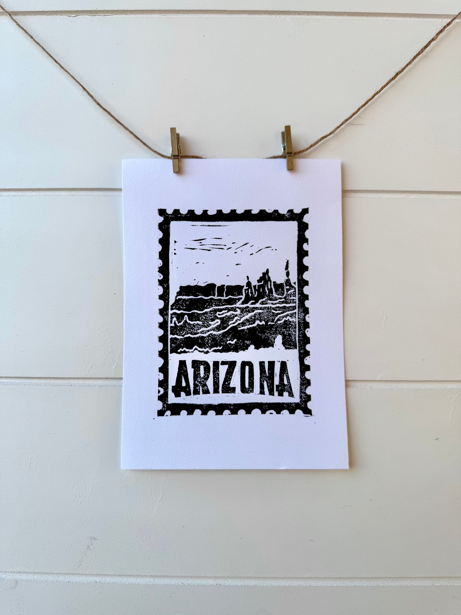 High-quality, 5x7 monochrome block print featuring bold, hand-carved lines and rich black ink on white paper. Each print is unique, showcasing the organic texture and depth of traditional block printing.